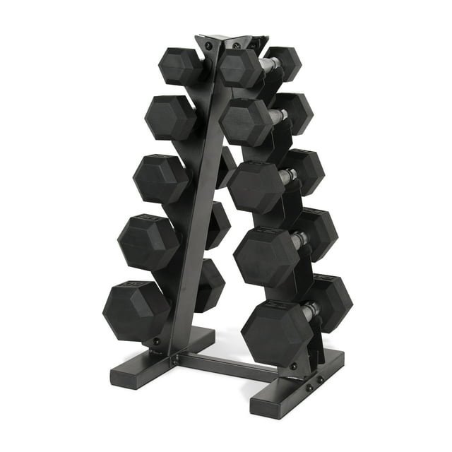 The  Black A-Frame Dumbbell Rack helps you organize your gym equipment and keep the floor clear. It features a staggered design with five levels on each side that allow for easy access and management. The rack is compatible with any hex or coated hex dumbbell weighing 5 to 25 lbs. It can support a maximum of 200 lbs. This compact dumbbell rack is sized just right to easily fit in cramped spaces, so it doesn't take up much room. Its quality construction will provide long-term durability. By holding your weights right where you need them, the F dumbbell rack Barbell makes your workouts more efficient and organized.