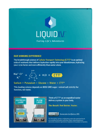 Liquid I.V.'s Hydration Multiplier is a great-tasting; non-GMO electrolyte powder drink mix powered by Cellular Transport Technology (CTT)® designed to enhance rapid absorption of water and other key ingredients into the bloodstream. Typically; when you drink fluids; they pass through the entire digestive system; losing water before your body can absorb it. CTT® uses a precise ratio of sodium; glucose; and potassium to create an osmotic force that allows water to be delivered to the bloodstream earlier on in the digestive system. Liquid I.V. Hydration Multiplier can hydrate faster and more efficiently than water alone. 1 serving contains 3x the electrolytes of traditional sports drinks and 5 essential vitamins.