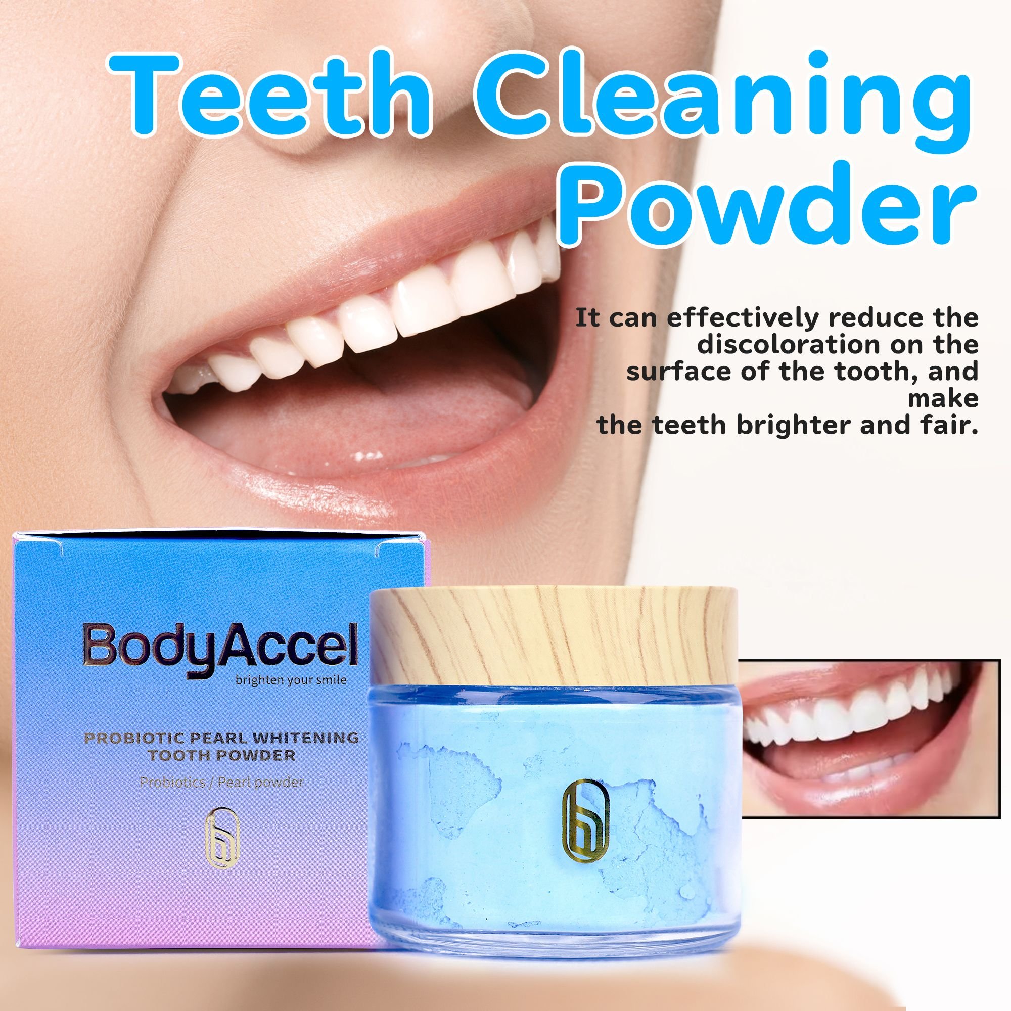 REMOVE YEARS OF STAINS SAFELY: Say goodbye to stubborn stains from coffee, tea, wine, smoking, and natural ageing with BodyAccel Teeth Whitening Powder. Our gentle, non-abrasive formula reverses deep-set stains for a brighter, whiter smile safely and effectively. Suitable for all types of teeth, including those with dental work.•SEE RESULTS IN A FEW USES: Achieve a stain-free, whiter and cleaner smile in just 2 minutes, twice a week! Our powder is ideal for busy lifestyles and eliminates the need for complicated kits or time-consuming strips, delivering quick, effective whitening results without disrupting your day.•SAFE FOR DENTAL WORK: Our Teeth Whitening Powder is safe for use on caps, crowns, bonds, and other dental work. Since dental work is often whiter than natural teeth, using our powder helps you maintain a consistent, uniform shade across all your teeth, ensuring a camera-ready, confident smile.