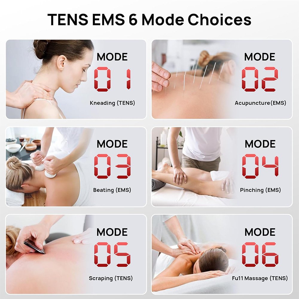 [Upgrades Friendly User Design]With more new upgrades: steady mode, powerful intensities, memory function, lock screen function, etc. In fact, steady 6 modes of Kneading, Acupuncture, Beating, Pinching, Scraping, and Full Massage are equivalent to the other 24 redundant modes. Friendly user one-key control of mode and gear adjustment of intensity. Upgrades tens unit designed to free up your hands and eliminate annoying complex buttons. Foxpeed tens unit muscle stimulator will far exceed your expectations.