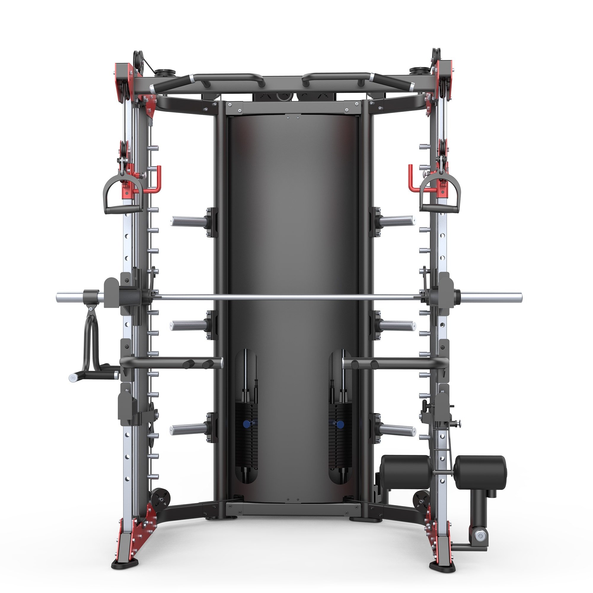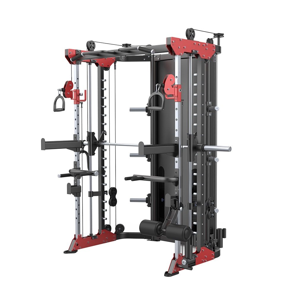 The Functional Smith Machine features the most popular training types in one. The best strength training solution for limited space. It has pull up/chin up bars, spotter arms, j hooks for squat and barbell rest, an outstanding cable system and probably 100 other features. The stable and reliable smith system provides fixed rails to help exercisers get lower while sta- bilizing training positions starting weight. Support single or multi-person training at the same time.