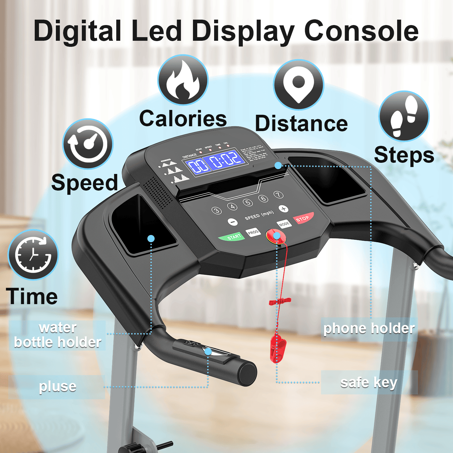 4.Cup Holder & Safety Key - This foldable treadmill console is equipped with 2 water bottle cages, which is convenient for you to rehydrate in time during your workout. The safety key is able to shut down the operation instantly for emergency, and protects you during exercise.
