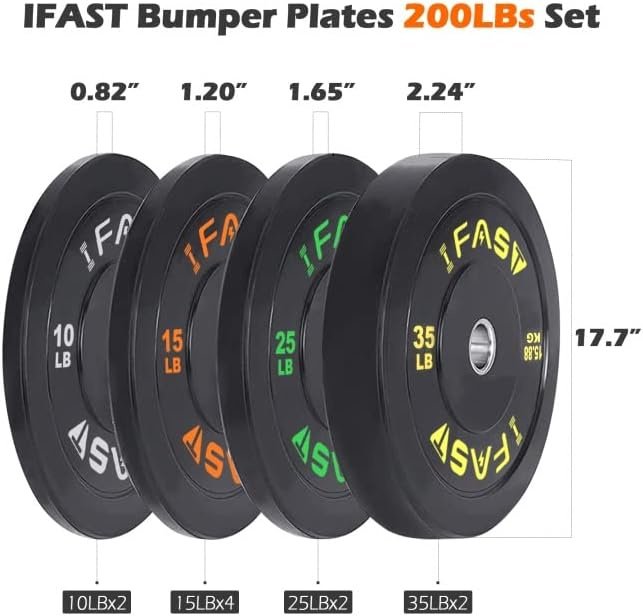 Weight PlatesMade of 100% high density rubber, each bumper plate has an inner ring with a diameter of 2"(IWF standard), fits any Olympic barbell or dumbbell bar with a 2inch diameter. The 200 LB WEIGHT SET contains: 1pair 10LBS, 2 pair 15LBS, 1pair 25LBs and 1pair 35LBs bumper plates.