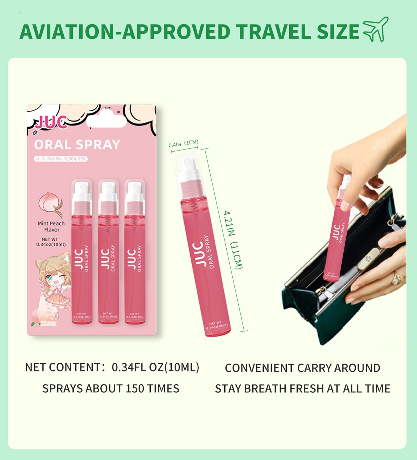 1.Contains 3 mouth sprays of cool mint flavor, each spray contains 0.33 oz (10 ml), has an aviation-approved travel size for easy portability and ready use