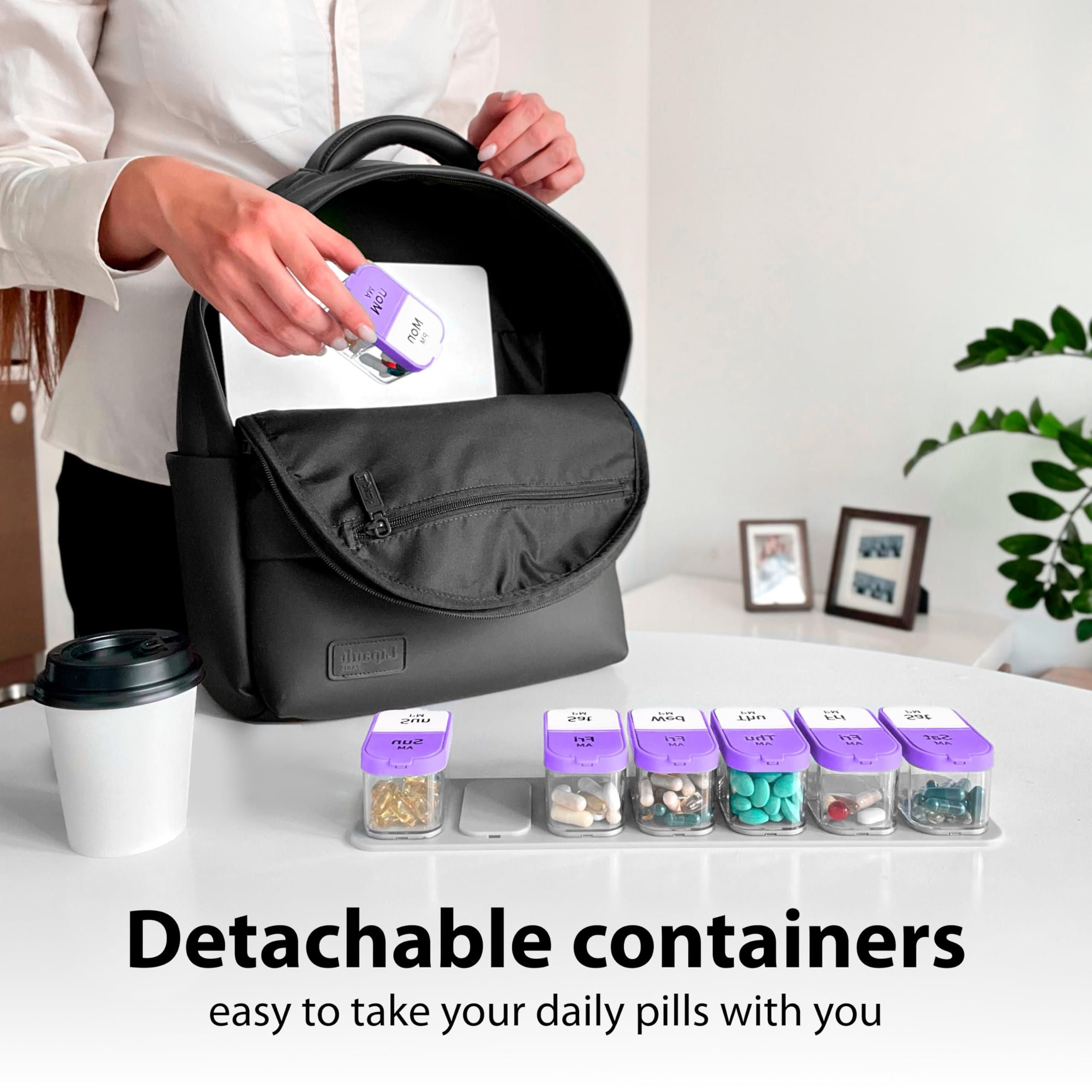 2.7 removable containers featuring 7 detachable compartments, this xl pill box 7 day offers ultimate flexibility. store your full supply on the stand and take only the container you need with you