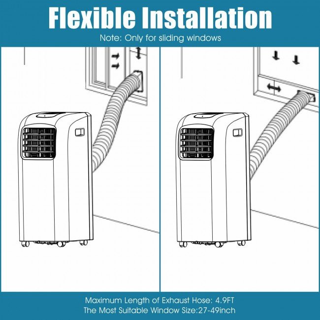 It comes with remote control for more convenient useIt offers cooling, dehumidifying, fanning and sleeping mode to meet various needs of usersQuiet operation (Noise52dB) in sleeping mode2 fan speedsVarious protection functions such as a 24-hour programmable timer, super intelligent temperature sensor, water-full control and warning, etcThis 8000BTU/H air conditioner unit delivers fast, effective cooling for spaces up to 400 sq. ftStrong airflow rate of 300m3/h that ensures fast air circulation10ft long drain hose that allows you to drain the water in the bathroom easilyEquipped with four all-direction casters for easy moving