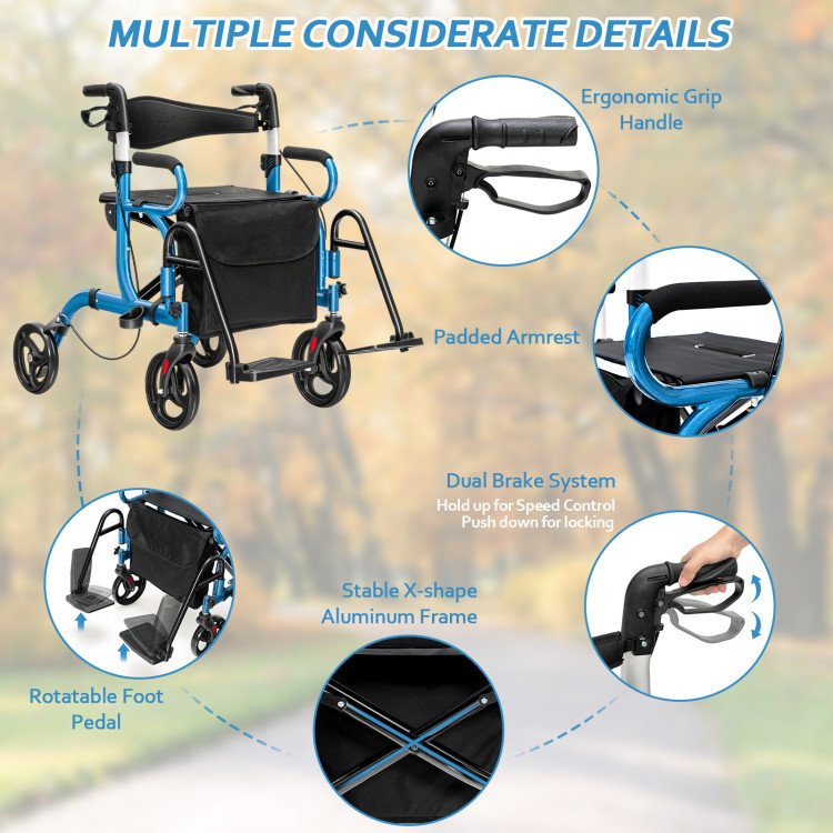 1.2-in-1 Practical Rolling Walker: This rollator walker is the perfect aid to help you walk easily when you are shopping or going for a walk. In addition, our walker comes with a folding footrest and reversible backrest, so you can adjust them to get a comfortable wheelchair that not only helps elderly and injured people to walk, but also relaxes your legs when you are tired.